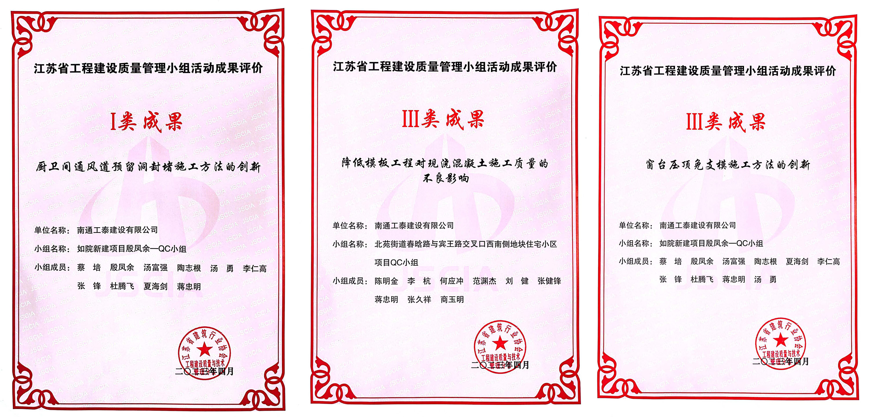 【概要描述】?? 近日,從省建筑行業(yè)協(xié)會(huì)工程建設(shè)質(zhì)量與技術(shù)管理分會(huì)上傳來(lái)好消息,南通工泰銀川分公司如院新建項(xiàng)目殷鳳余QC小組的《廚衛(wèi)間通風(fēng)道預(yù)留洞封堵施工方法的創(chuàng)新》、《窗臺(tái)壓頂免支模施工方法的創(chuàng)新》、浙江分公司義烏北苑街道春晗路與賓王路交叉口西南側(cè)地塊住宅小區(qū)項(xiàng)目QC小組的《降低模板工程隊(duì)現(xiàn)澆混凝土施工質(zhì)量的不良影響》分別榮獲江蘇省工程建設(shè)質(zhì)量成果一類(lèi)、三類(lèi)成果。
